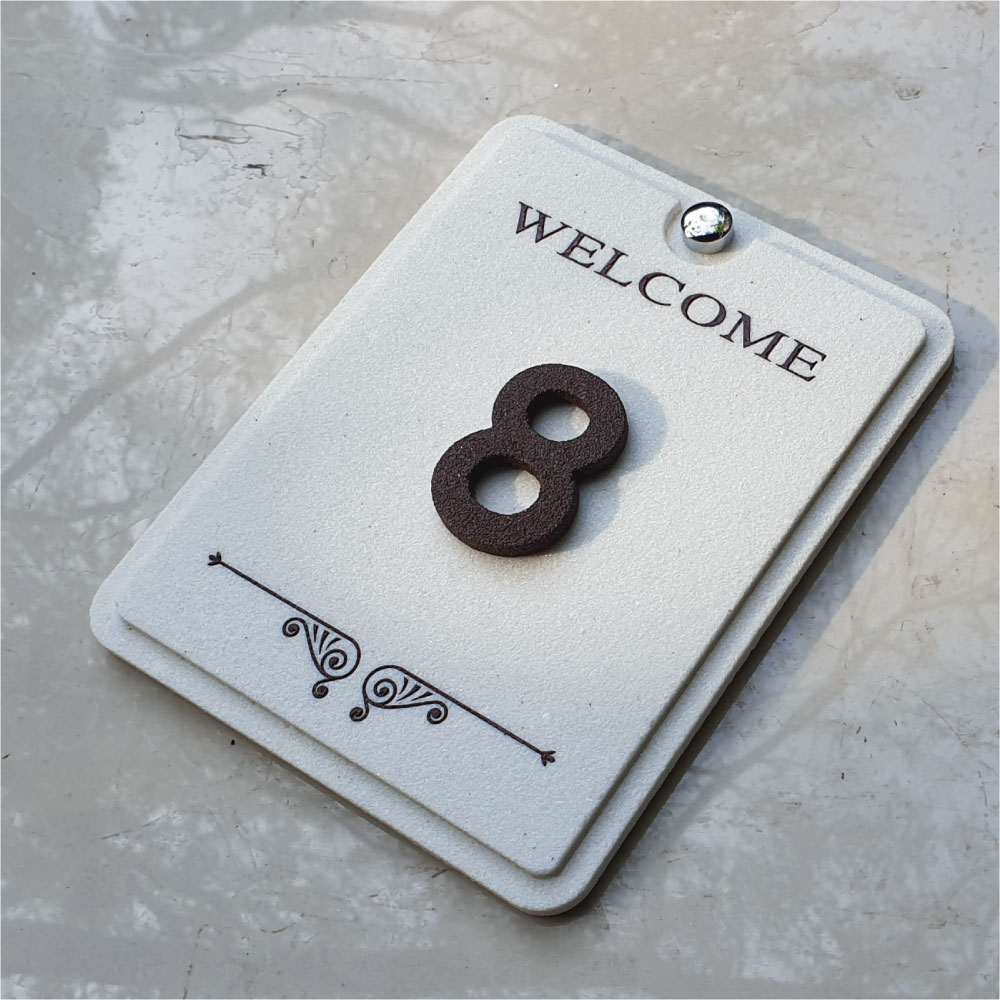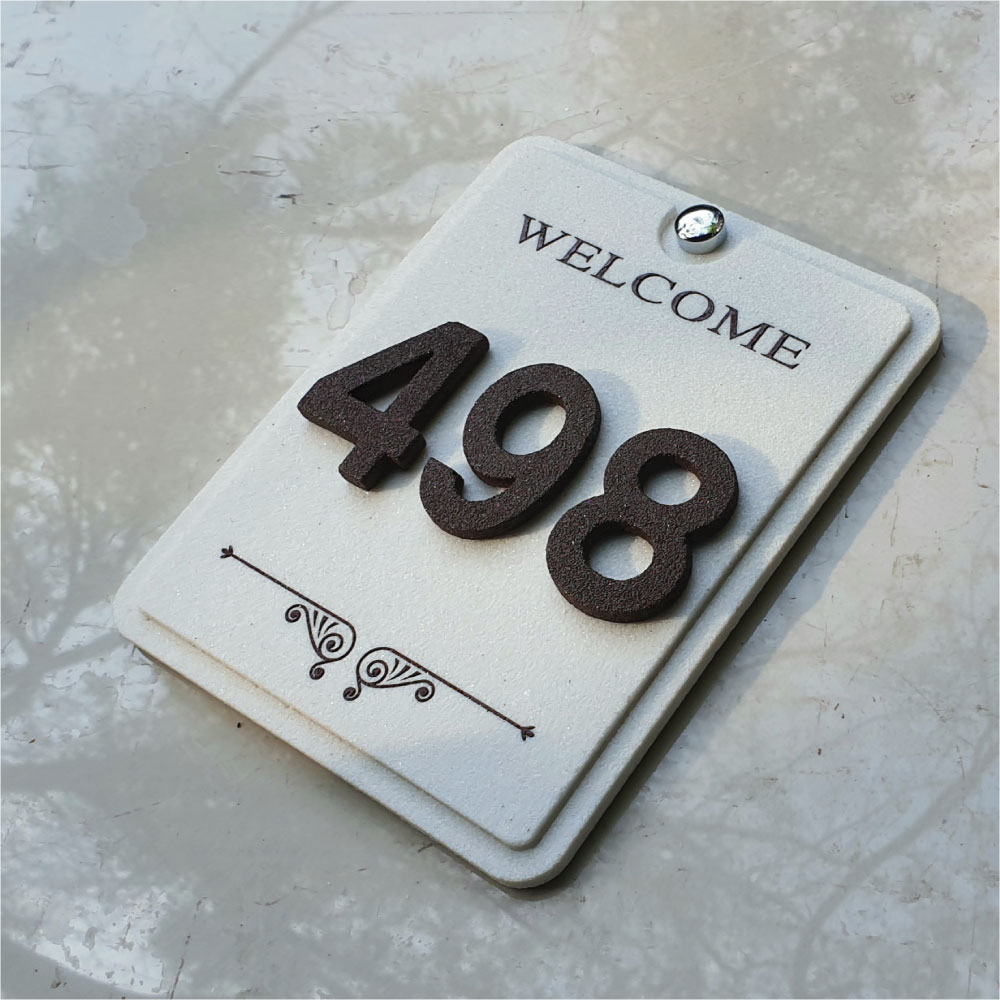ป้ายบ้านเลขที่ แนวตั้งสีขาวตัวเลขสีโอ๊ค ลาย Welcome ป้ายสวยๆ เหมาะสำหรับตัวเลข 1-3 หลัก ขนาด 13.5 x 17 cm ป้ายเลขห้อง ป้ายทะเบียนบ้าน House Number Sign เนื้อเรซิ่นหินทรายแท้ พื้นผิวขรุขระเห็นเม็ดหินระยิบระยับ มีเอกลักษณ์โดดเด่น ไม่ลายตา ทนแดดฝน